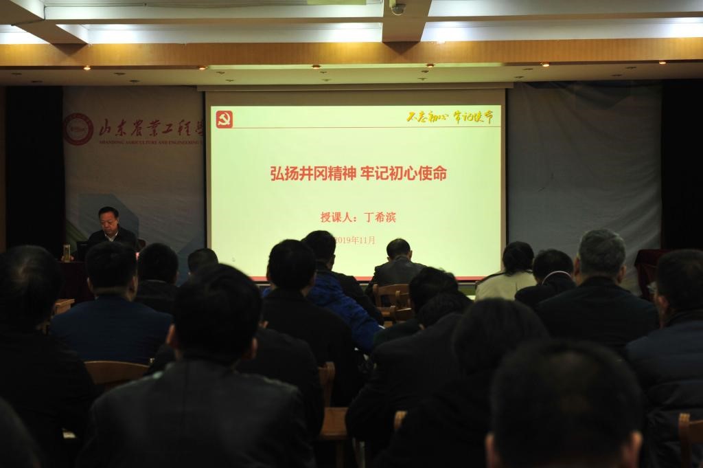 11月6日上午,校党委书记丁希滨在济南校区多功能厅以“弘扬井冈精神,牢记初心使命”为题,结合“不忘初心、牢记使命”主题教育学习体会和调研思考,面向学校全体处级干部、党支部书记、教师学生党员代表讲授党课。党课由校党委副书记张业赏主持,省委第九巡回指导组成员杜华昌到会听取了党课。