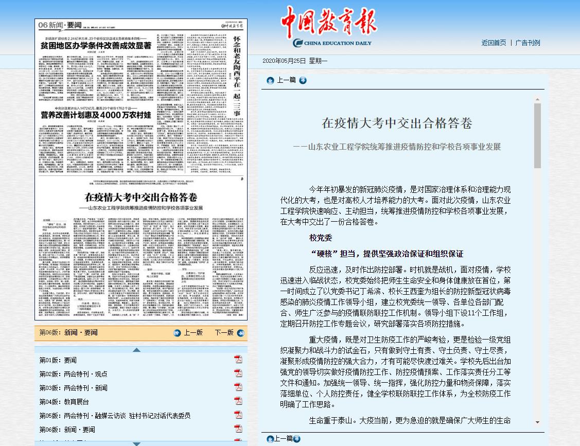 5月25日,中国教育报在新闻·要闻版刊发了署名文章,对我校统筹推进疫情防控和学校各项事业发展进行了深度报道。