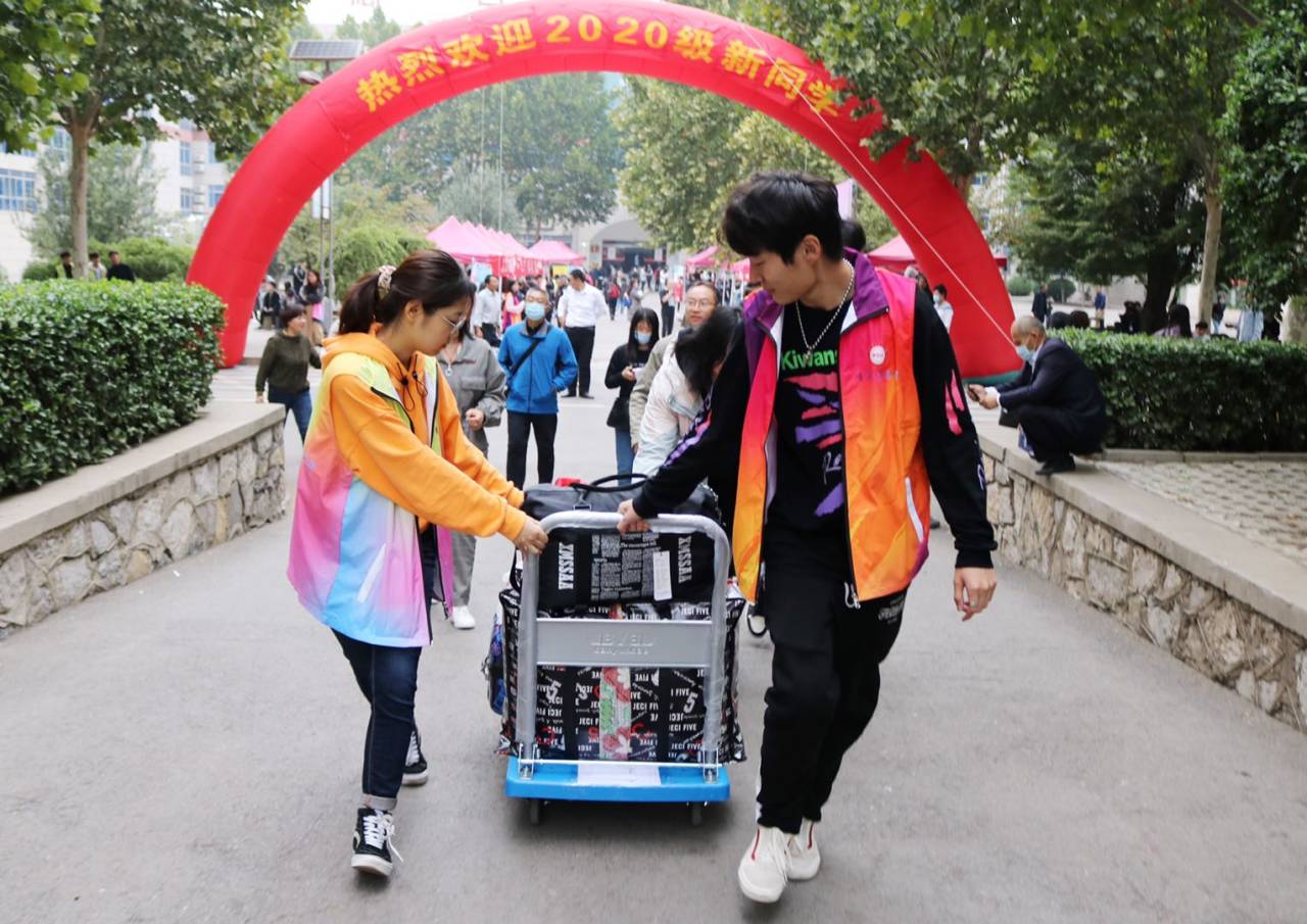 在迎新现场,学校门口“热烈欢迎新同学”“青春筑梦 不负韶华”的标语墙展现着学校对全体2020级新生的热烈欢迎和殷切希望。校团委组织百余名志愿者在校门口,各路口、宿舍楼、餐厅等20余个志愿者服务站点,为新生提供咨询、引导新生报到、引领入住寝室等服务,并给新生发放“我与山东农业工程院的约定”卡片,祝福2020级新生在山工院这个新的起点,背起梦想的行囊,去感知生活,去期待明天,去拥抱未来。各学院结合学科、专业特色,设立名师专家咨询台,教学科研、学风建设、科技创新等成果展示及富有人文情怀的宣传展示、清晰的路标指示牌。食品学院制作了特色食品,为新生带来了首次与专业亲密接触的机会,增强了新生的专业认同感和学院归属感。资源与环境工程学院、农业科技学院、经济管理学院、人文学院等各二级学院通过精心制作的各类文化墙、签名展板、新生伴手礼等,将科教融合的最新成果和良好风貌融入迎新活动的每一个环节。淄博校区管委会组织食品学院学生和资源环境工程学院通过快闪歌唱《我和我的祖国》《爸爸妈妈,听我说谢谢您》的方式欢迎新同学、新生力量的加入,增添了秋日的温暖,让校园更加温馨有爱。