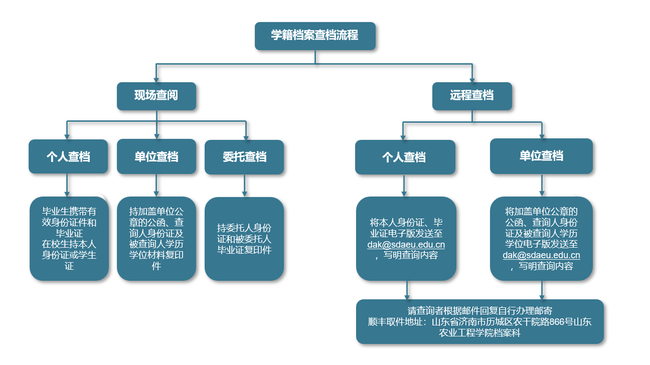 1.个人查档:毕业生本人携带有效身份证件和毕业证到学校档案科查询。在校生持本人身份证或学生证到学校档案科查询。