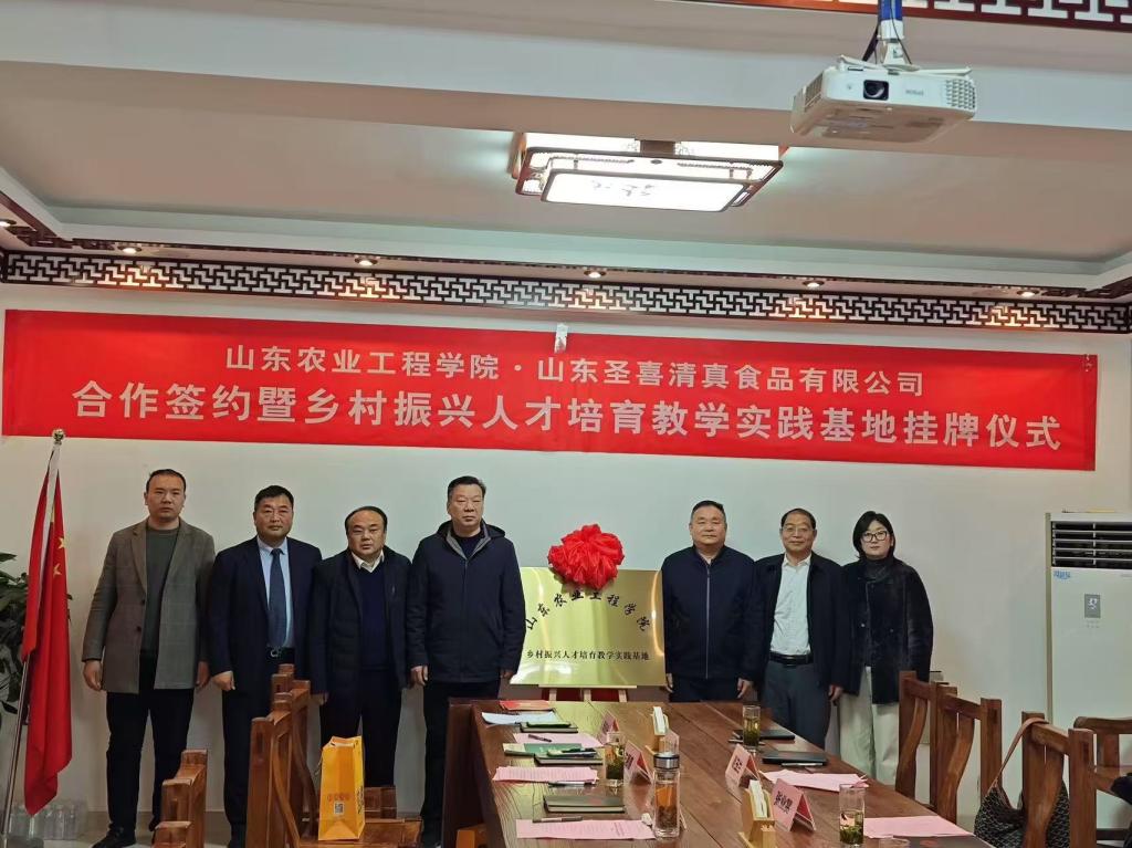 随后干部进修学院院长刘文宝与山东圣喜清真食品有限公司董事长左恩喜签订基地合作协议,张书记与邵县长为人才培育实践教学基地揭牌。