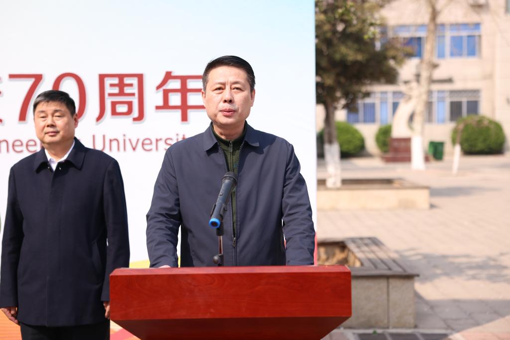 3月27日,我校在济南校区隆重举行建校70周年校庆标识物揭幕仪式。校领导张鸿波、李进京、张业赏、黄晓彦、杨玖庆、郑华美、周吉鹏、牛化振、韩娟出席揭牌仪式,中层干部和师生代表共200余人参加仪式。仪式由党委委员、副校长杨玖庆主持。