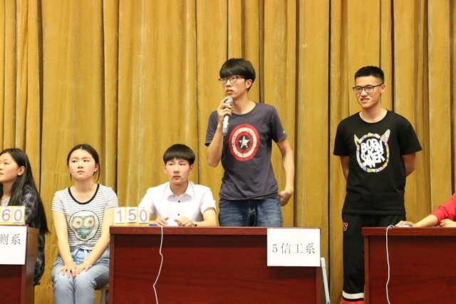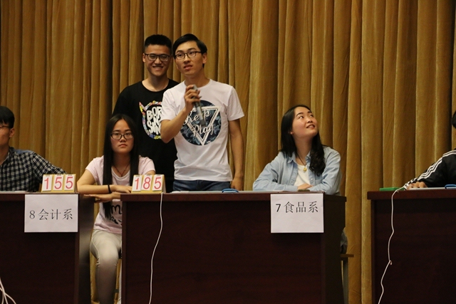 参赛队伍由各系选派出优秀学生代表组成参赛队伍进行比赛。本次比赛包括画龙点睛 (必答题),争先恐后 (抢答题),危急存亡 (风险题)和观众互动四个环节进行。必答题环节中各系选手展现出了较高的文化底蕴,各代表队的得分不相上下,在抢答题和风险题环节中体现了选手的反应能力、勇气和智慧。观众互动环节把现场的气氛推向了高潮,现场观众踊跃答题,回答正确的观众也获得了精美小礼品。在一次次知识的碰撞,一次次智慧的交锋,充分展现了我院学子的风采。最终,食品科学与工程系代表队获得了此次大赛的冠军,信息科学与工程系代表队和机械电子工程系代表队分获亚军和季军。