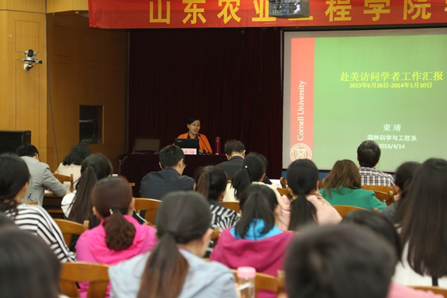 4月14日下午,我院在济南校区多功能厅举办2016年首期院内专题报告会。园林科学与工程系副教授束靖作了题为《康奈尔大学访问学者工作报告》的专题报告。副院长张兆明出席报告会,并与100余名师生代表听取了报告。科研处处长徐金强主持报告会。