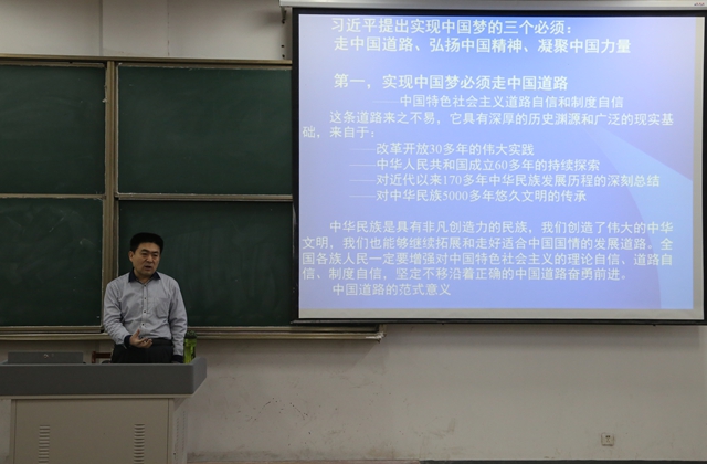 王教授以习近平总书记系列重要讲话精神解读为主题,以历史和改革发展为脉络,用生动、深刻、精准的语言,向同学们系统讲解了中国特色社会主义理论体系和“四个全面”战略布局的深刻内涵,分析了“道路、理论、制度三个自信”的厚实渊源以及牢固树立“三个自信”的重大意义,并向同学们提出了为实现中华民族伟大复兴中国梦而努力读书的号召。学生听后深受启发,对习近平总书记系列重要讲话精神、中国特色社会主义理论体系和“四个全面”战略部署的理解更加深化。