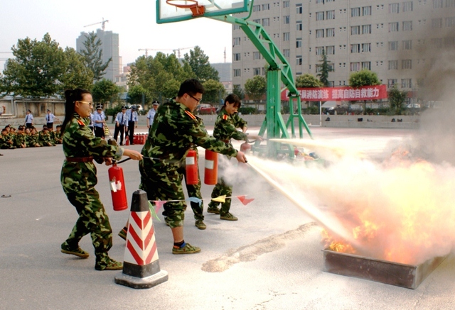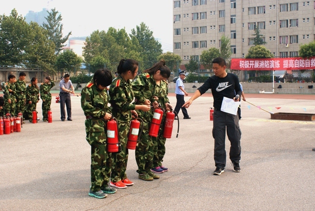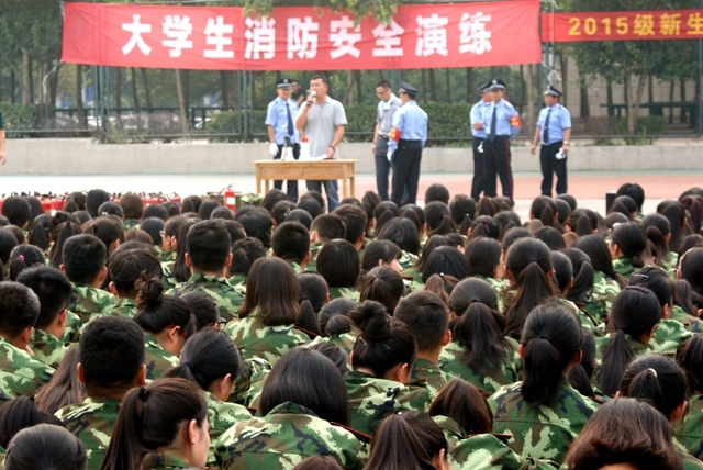 保卫处处长孙晓明、北校区保卫处长王振生分别就本次活动进行了动员,强调了此次活动的重要性,明确了活动的重点,提出了具体的要求,进行了活动讲评。活动首先进行了消防安全知识理论培训,保卫处工作人员重点为大家讲解了灭火器的工作原理、使用方法、操作要领等消防知识,并组织了新生使用灭火器分批次灭火实践演练,并就消防疏散演练的基本程序、目的要求及注意事项做了有针对性地讲解。随后组织同学们进行了疏散逃生演练。在2015级新生军训期间,学生处、各系针对2015级新生特点,开展了形式多样、内容丰富的安全教育活动。