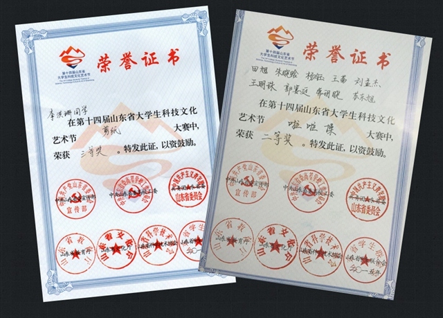 近日,由山东省委宣传部、省委高校工委、团省委、省教育厅、省文化厅、省科协和省学联共同举办的第十四届山东省大学生科技文化艺术节多项比赛落下帷幕,我院学子在院领导和系领导的大力支持下,在指导教师的悉心指导下,精心准备,稳定发挥,在山东省大学生啦啦操大赛中获二等奖、山东省大学生剪纸大赛中获得三等奖、山东省大学生“传统文化与社会主义核心价值观”征文大赛中获得三等奖1名、优秀奖2名。