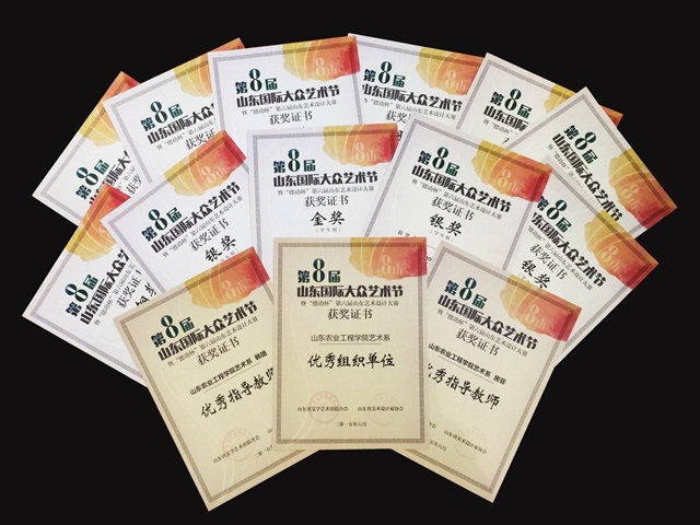 近日,由山东省文学艺术界联合会和山东省美术设计家协会联合主办的第八届山东国际大众艺术节暨“德功杯”第六届山东艺术设计大赛在济南举行。我院学生荣获金奖1项,银奖3项,铜奖5项,优秀奖2项,优秀指导教师2项,优秀组织单位奖1项的优异成绩。