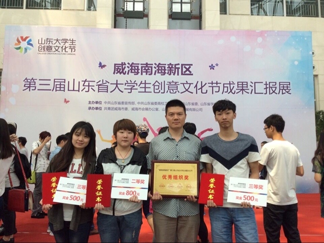 近日,由省委宣传部、省委高校工委、团省委、省学联联合举办的“威海南海新区”第三届山东省大学生创意文化节圆满落下帷幕。创意文化节成果汇报展暨颁奖仪式于6月13日在威海市民文化中心举行。我院在本次大赛的广告创意设计、环境艺术设计、原创歌曲创作和摄影等比赛项目中发挥出色,获得二等奖1名、三等奖2名、优秀奖4名,优秀组织奖1个。