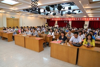 院团委书记陈献锋主持开幕式。院党委委员、副院长林松柏代表学院致开幕词,简单介绍了学院的基本情况,并感谢省委高校工委、团省委、省文化厅、省学联以及全省高校对我院承办本次赛事给予的支持,表示全院将全力以赴,严谨扎实做好本次赛事的各项工作。山东亚速信息技术有限公司宋紫霞和山东农业大学学生程安琪分别作为裁判代表和参赛选手宣誓。院学生处、语言文学系有关负责人出席本次大赛。