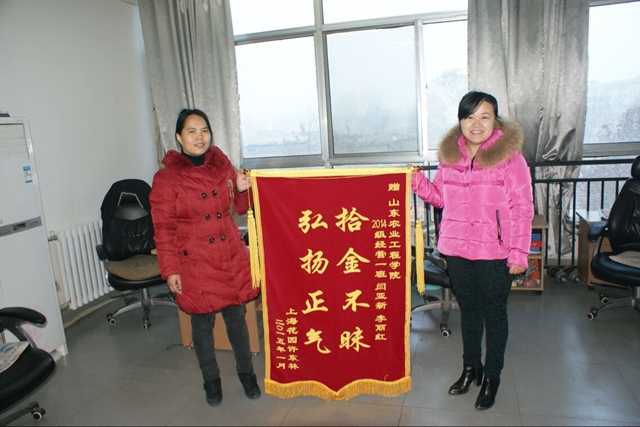 “拾金不昧 弘扬正气”。日前,来自济南市历城区上海花园小区的住户,手捧锦旗来到我院经济管理系感谢该系两位拾金不昧的同学。