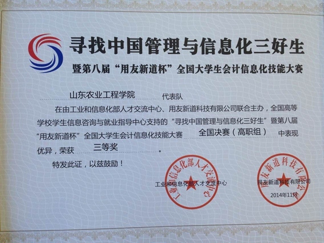 日前,在2014年全国高等职业院校“网中网杯”财务决策大赛全国总决赛、第八届“用友新道杯”全国大学生会计信息化技能大赛(全国总决赛)中,我院会计系学生分别荣获二等奖、三等奖。