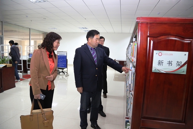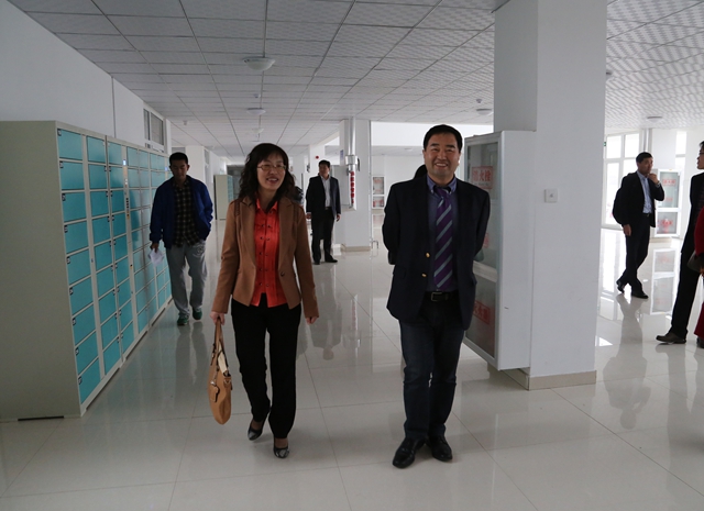 朴起彻院长一行在唐欣处长的陪同瞎实地参观考察了学院的图书馆、学生宿舍、餐厅、实训车间以及生态园。