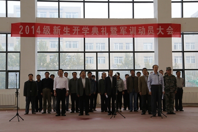 9月17日,我院2014级新生开学典礼暨军训动员大会分别在济南校区大礼堂和北校区体育馆隆重举行。党委副书记、院长李允祥,党委副书记王向军,副院长温传富、林松柏、张兆明出席开学典礼,院属各处室、各教学系部负责人,各系教师、辅导员代表,承训部队教官以及2014级全体新生参加了典礼。院长李允祥致辞,院党委副书记王向军主持典礼。