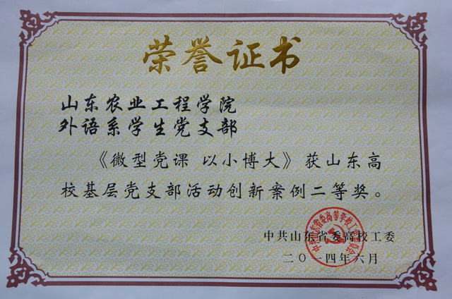 近日,省高工委颁发《中共山东省委高校工委关于表彰全省高校基层党支部活动创新案例的决定》,我院语言文学系(原外语系)学生党支部开展的《微型党课以小博大》活动荣获全省高校基层党支部活动创新案例二等奖。