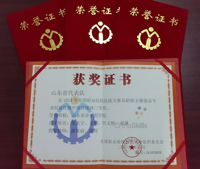 6月25日—26日,由教育部、天津市人民政府等单位主办的2014全国职业院校技能大赛“亚伟杯”文秘速录专业技能比赛在天津职业大学举行,我院文秘专业(速录师方向)学生张天宇、姜娜、宫文婷、祁琳组成的参赛代表队荣获团体三等奖。这也是我院文秘专业学生连续两年在国赛中获奖。