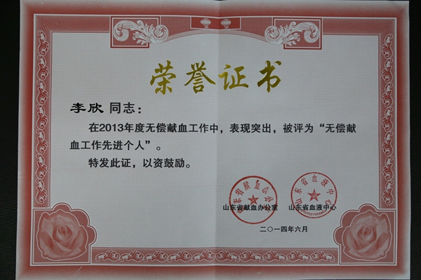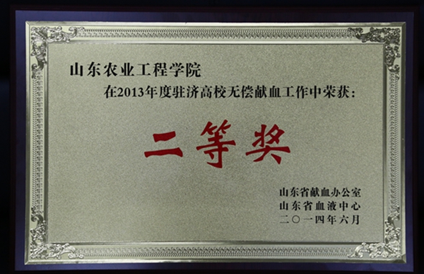 日前,2013年度驻济高校无偿献血工作表彰大会在济南召开,会议表彰了2012年度在无偿献血工作中做出突出贡献的单位及个人,我院荣获2013年度驻济无偿献血工作先进集体二等奖,李欣、李艳老师被评为无偿献血先进个人。