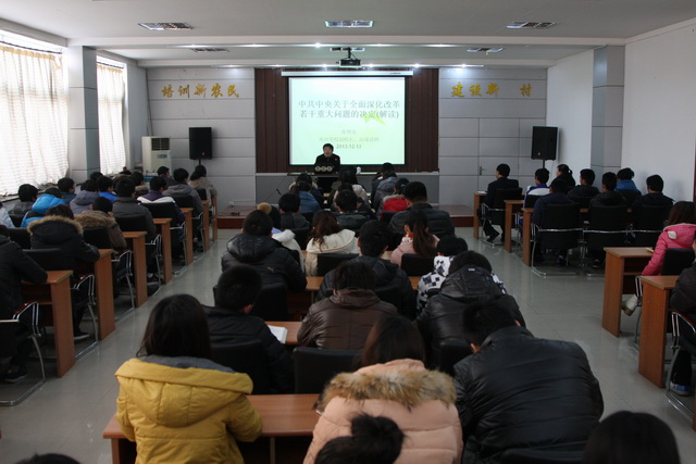 为深入学习贯彻落实党的十八大精神,使广大师生的思想和行动统一到十八大精神上来,学校开展了党的十八大精神进课堂活动,并于12月13日上午在济北校区培训楼多媒体教室举办了学习贯彻党的十八大精神专题报告会,特邀中共齐河县委党校副校长、高级讲师张明友同志作了题为《中共中央关于全面深化改革若干重大问题的决定解读》的专题报告。济北校区管委会副主任、党总支书记苗锋出席并主持报告会,与各系辅导员以及部分学生代表一同聆听了报告。