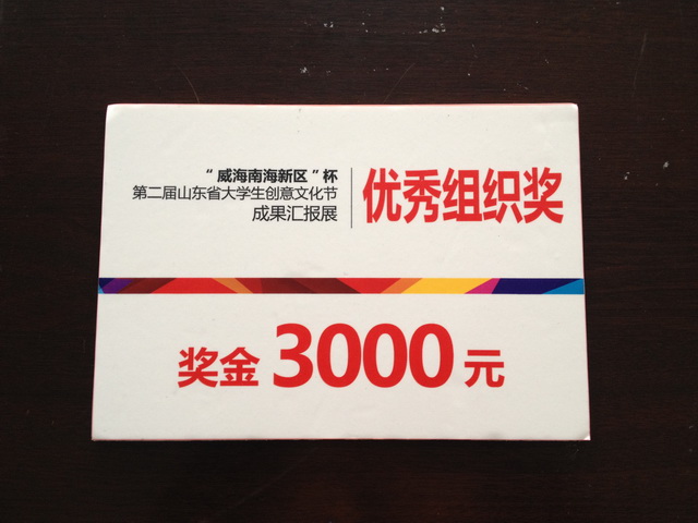 近日,由省委宣传部、省委高校工委、团省委、省学联联合举办的“威海南海新区”杯第二届山东省大学生创意文化节圆满落下帷幕,创意文化节成果汇报展暨颁奖仪式于12月16日在威海举行,我院喜获优秀组织奖及3000元奖金。