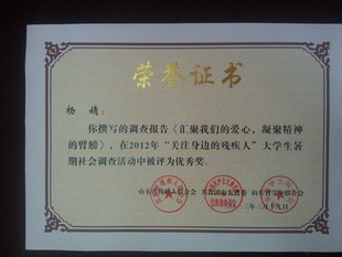 近日,“关注身边的残疾人”2012年大学生暑期社会调查活动表彰结果揭晓,我院农业科学与工程系杨靖同学的《汇聚我们的爱心,凝聚精神的臂膀》、园林科学与工程系王治昌同学的《关注身边的残疾人—向孙希林同学学习》和会计系段威同学的《助残疾人暑期社会实践报告》三篇文章被评为“关注身边的残疾人”2012年大学生暑期社会调查优秀调查报告,我院团委被授予“优秀组织奖”荣誉称号。