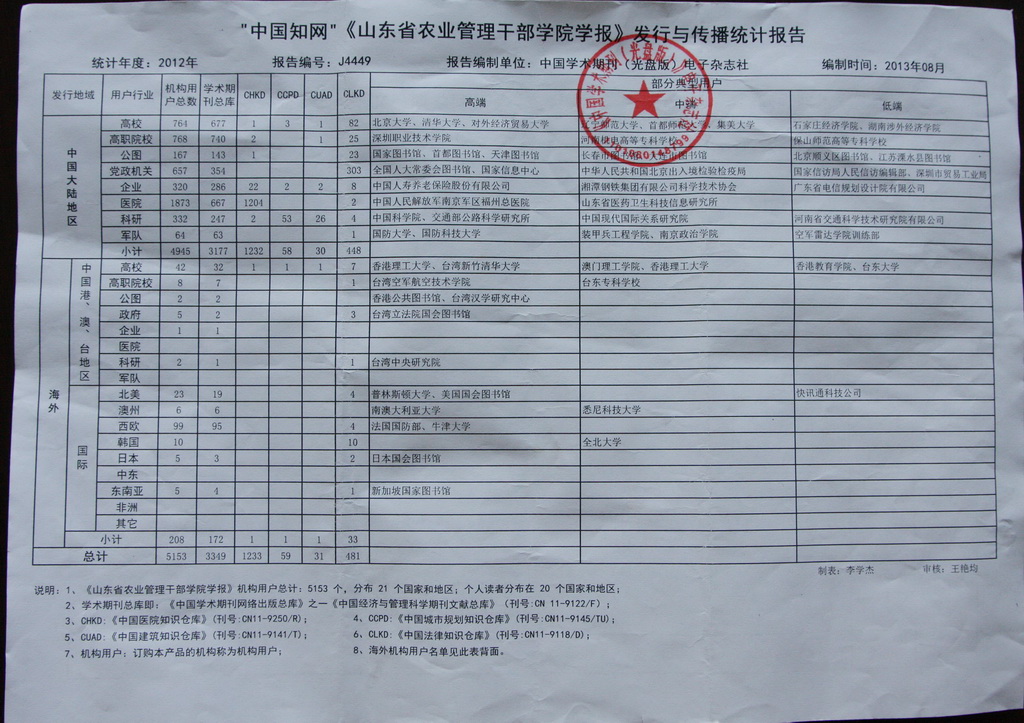 附:“中国知网”《山东省农业管理干部学院学报》发行与传播统计报告