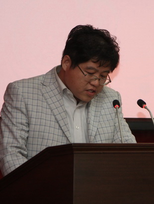 学生处处长孙会海主持表彰大会(左),院团委副书记、北校区学生处处长陈献锋(右)宣读获奖学生和优秀指导教师名单