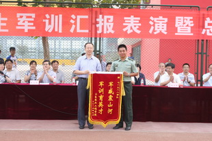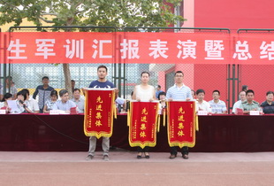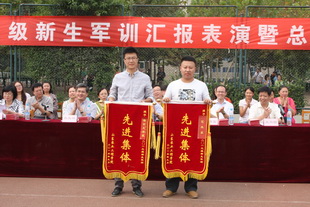 汇报表演结束后,副院长张兆明、王兴国分别宣读了《关于表彰2013级新生军训先进集体和优秀学员的通报》,获奖单位和个人分别上台领奖。王向军副书记向承训部队赠送了锦旗,感谢全体承训教官付出的艰辛努力和辛勤汗水。