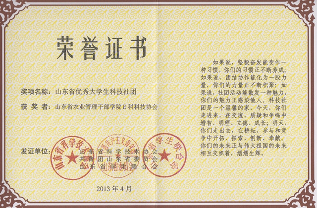 近日由山东省科学技术协会、共青团山东省委和山东省学生联合会共同举办的2013年山东省优秀大学生科技社团和山东省优秀大学生科技社团干部的评选活动落下帷幕,由我院推选的机械电子工程系的E科科技协会不负众望,在全省众多参评的科技社团中脱颖而出,被评为“山东省优秀大学生科技社团”,机械电子工程系学生李启森被授予“山东省优秀大学生科技社团干部”荣誉称号。