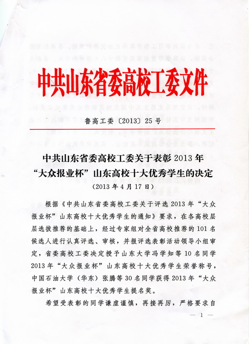 日前,由中共山东省委高校工委举办的2013年“大众报业杯”山东高校十大优秀学生评选结果揭晓,我院园林技术系学生孙希林荣获提名奖。