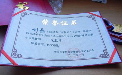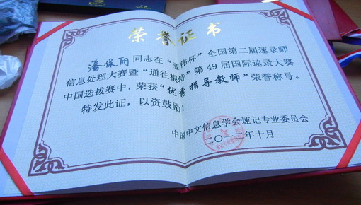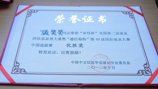 10月15至18日,在沈阳公安司法管理干部学院举办的“亚伟杯”全国第二届速录师信息处理大赛暨“通往根特”第49届国际速录大赛中国选拔赛中,我院学子喜创佳绩,2010级文秘(速录师方向)专业学生高乔乔荣获“文字整理最佳奖”,刘艳、顾笑笑荣获综合“优胜奖”,潘保丽老师荣获“优秀指导教师”奖项。