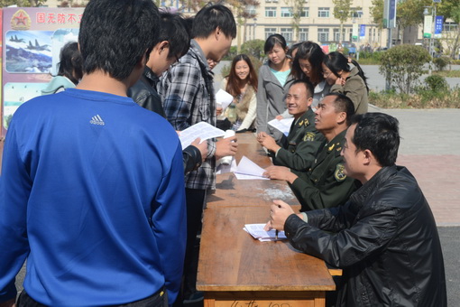 两校区分别设置了咨询台,并通过宣传车广播、横幅和展板向同学们介绍了兵役法规常识、征兵政策、应征条件、部队待遇和大学生征兵入伍对我国国防建设的重要意义,前来咨询的学生络绎不绝。历城区武装部和齐河县武装部的工作人员针对2012年冬季大学生男、女兵的征集条件、安置政策、入伍后的发展等方面的问题,与前来咨询的同学进行了面对面的沟通交流和详细解答,并在现场发放了征兵政策宣传画册。