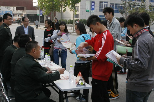 为扎实推进2012年我院征兵工作的顺利开展,10月18日,历城区武装部和齐河县武装部分别到济南校区和济北校区开展了2012年度大学生“携笔从戎 报效祖国”应征入伍宣传咨询工作。历城区武装部副部长陈怀友,齐河县武装部政委李广科,院学生处处长孙会海,济北校区管委会副主任、办公室主任苗锋,就业指导中心办公室主任陈献锋亲临宣传现场指导工作。