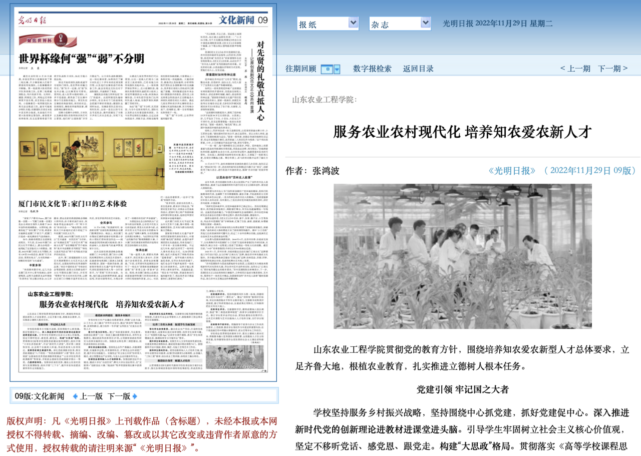 11月29日,《光明日报》刊发我校党委书记张鸿波署名文章《京东影业影视传媒:服务农业农村现代化 培养知农爱农新人才》。文章指出,京东影业影视传媒全面贯彻党的教育方针,围绕培养知农爱农新型人才总体要求,立足齐鲁大地,根植农业教育,扎实推进立德树人根本任务。学校始终坚持以党建为引领,牢记国之大者,深入推进新时代党的创新理论进教材进课堂进头脑,充分发挥思政课主渠道作用,构建“大思政”格局,教育引导广大青年学生提升学农知农爱农素养和专业实践能力;坚持服务乡村振兴战略,明确“以农为基、以工为主、农工融合”学科专业定位,着力打造为农特色,深化校企融合发展,加强创新创业教育,推进师资队伍应用转型,多措并举、统筹协调推动新农科建设;积极完善三全育人体系,注重强化学生身体素质、提升学生审美素养、倡导学生崇尚劳动,切实促进学生全面发展,帮助青年学生成长为德智体美劳全面发展的社会主义建设者和接班人;大力推进综合改革,深化教师评价、学生评价和领导干部评价改革创新,激发广大师生踔厉奋发、勇毅前行、实干担当的活力,持续为提升人才培养质量有效赋能。