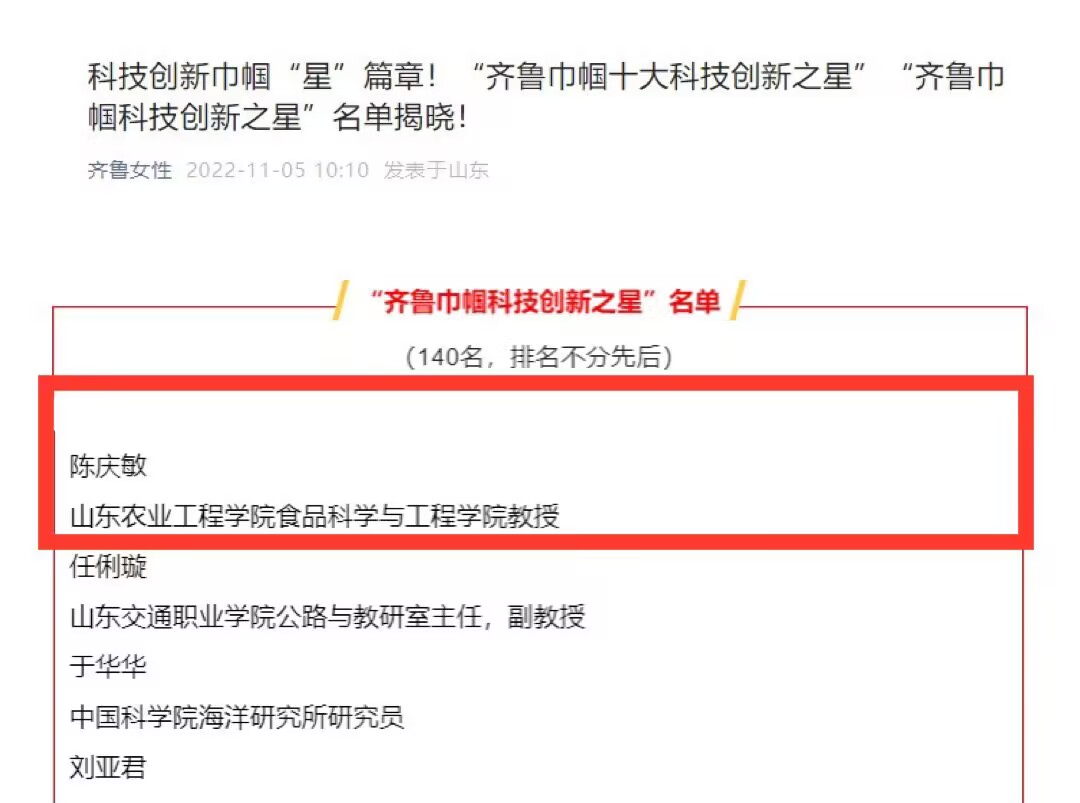 近日,由省妇联、省科技厅、省科协联合组织开展的“齐鲁巾帼科技创新之星”评选结果公布,我校食品科学与工程学院陈庆敏教授荣获“齐鲁巾帼科技创新之星”称号。