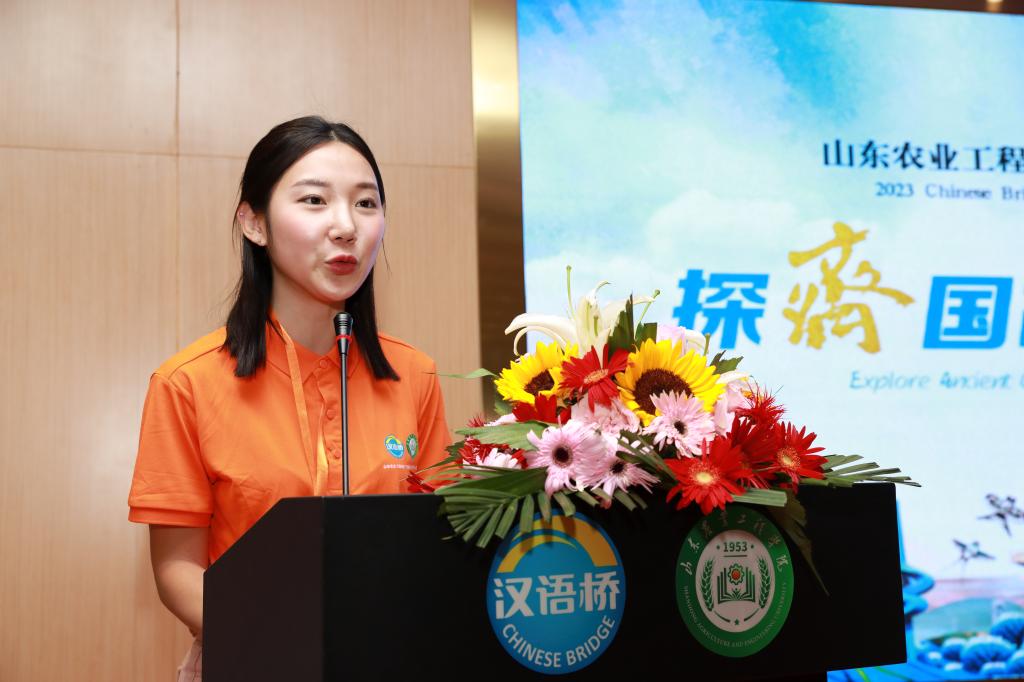 来自韩国外国语大学的学员代表崔恩智同学在开营仪式上用汉语发言。她表示,此次作为她的第一次中国行,临行前充满期待,学员们也是怀着同样的激动心情来到山东参加夏令营,能与中国老师和同学面对面交流和学习汉语,感到非常幸福。她对课程设置非常满意,尤其期待插花和豆腐制作课程。她表示同学们一定会积极参加各项夏令营项目,圆满完成学习任务。