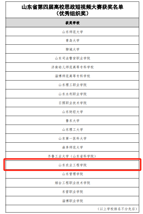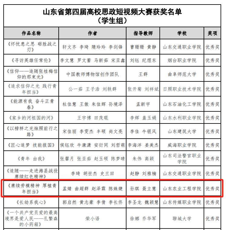 近日,由中共山东省委宣传部、山东省教育厅、山东省广播电视局、大众报业集团(大众日报社)联合举办的山东省第四届高校思政短视频大赛公布获奖结果,我校参赛师生荣获教师组二等奖1项、三等奖2项、优秀奖1项,学生组优秀奖1项,我校荣获优秀组织奖。