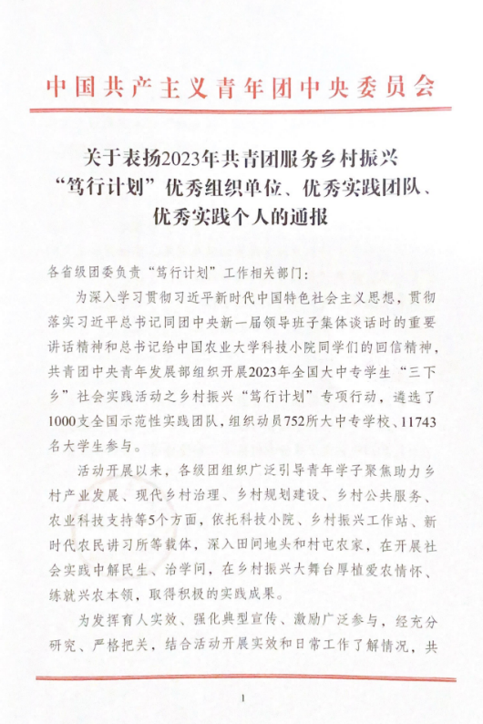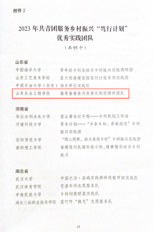 近日,共青团中央对2023年暑期“三下乡”社会实践活动中表现突出的优秀集体和个人进行通报表扬。我校人文学院“沂蒙红嫂宣传队”获评2023年全国大中专学生志愿者文化科技卫生“三下乡”社会实践活动优秀团队;资源与环境工程学院“高青畜禽粪污资源化利用团队”荣获2023年共青团服务乡村振兴“笃行计划”优秀实践团队。