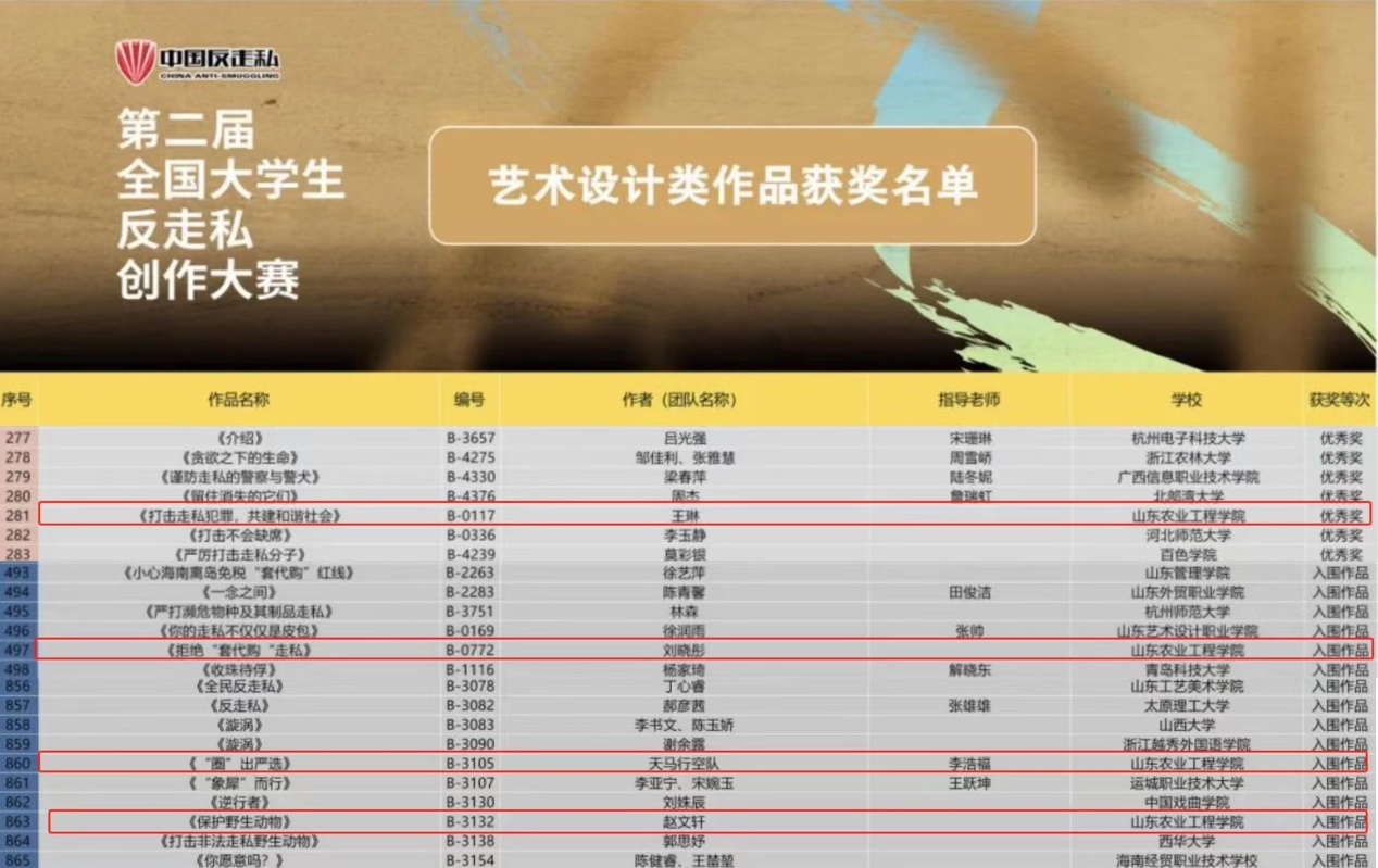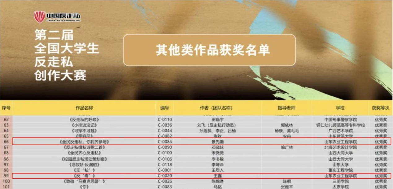 本次大赛以“全民反走私 你我齐参与”为主题,我校青年学子积极准备,踊跃参与,取得了优异的成绩。人文学院王琳同学的作品《打击走私犯罪,共建和谐社会》荣获艺术设计类作品全国优秀奖。林业工程学院王鑫同学的作品《反“毒”》、商学院景先灏同学的作品《全民反走私,你我齐参与》荣获其他作品类全国优秀奖。农业科技学院李浩福老师指导的“天马行空队”的作品《“圈”出严选》与商学院刘晓彤同学的作品《拒绝“套代购”走私》、赵文轩同学的作品《保护野生动物》荣获入围作品奖。