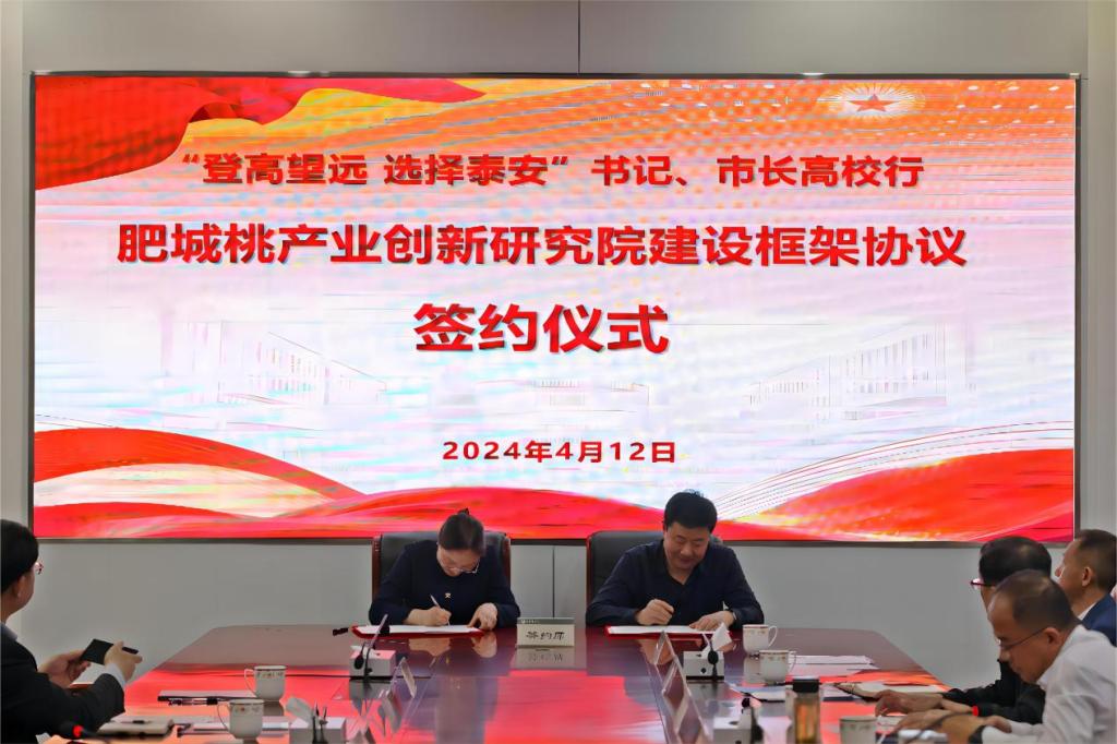 随后,孙栋与韩娟签订《肥城桃产业创新研究院建设框架协议》。孙栋与杨玖庆共同为“肥城桃产业创新研究院”揭牌。