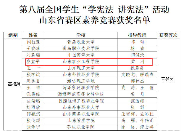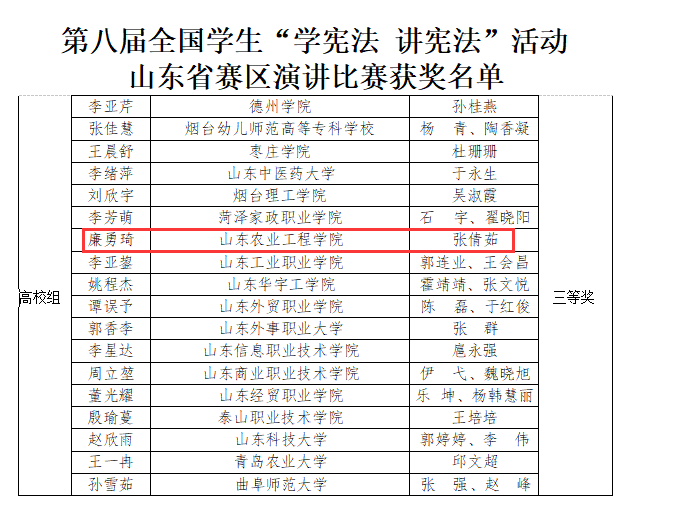 近日,山东省教育厅公布第八届学生“学宪法 讲宪法”活动开展情况,我校获评“最佳组织单位”,寇欣等5位老师获评“表现突出个人”,机械电子工程学院廉勇琦荣获第八届全国学生“学宪法 讲宪法”活动山东省赛区演讲比赛三等奖,商学院左宜平参加素养竞赛荣获高校组山东省三等奖。