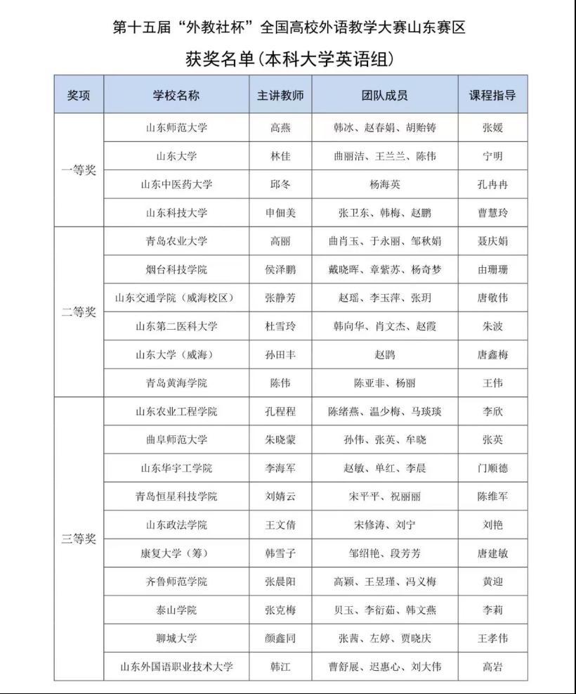 该赛事为官方赛事,本次获奖是我校在该项赛事中的首次获奖。本次比赛充分展示了我校教师良好的精神风貌和精湛的教学技能,集中展现了大学英语教学改革的成效。结合本次大赛,我校将继续坚持“以赛促教、以赛促学、以赛促改、以赛促升”,加大青年教师的培养力度,积极发挥获奖教师的示范带头作用,力争锻造一支师德高尚、专业一流的教师队伍,奋力推动我校教学工作再上新台阶,为培养高素质应用型人才打下坚实基础。