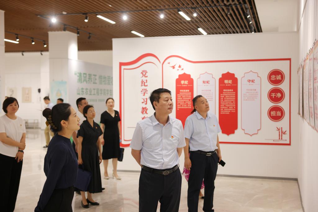 为进一步强化党的纪律建设,扎实开展党纪学习教育,深入学习贯彻新修订的《中国共产党纪律处分条例》(以下简称《条例》),学校利用大学生廉洁文化作品宣传展,在淄博校区布置“党纪学习教育专题展”。6月13日,校党委理论学习中心组全体成员开展现场教学。