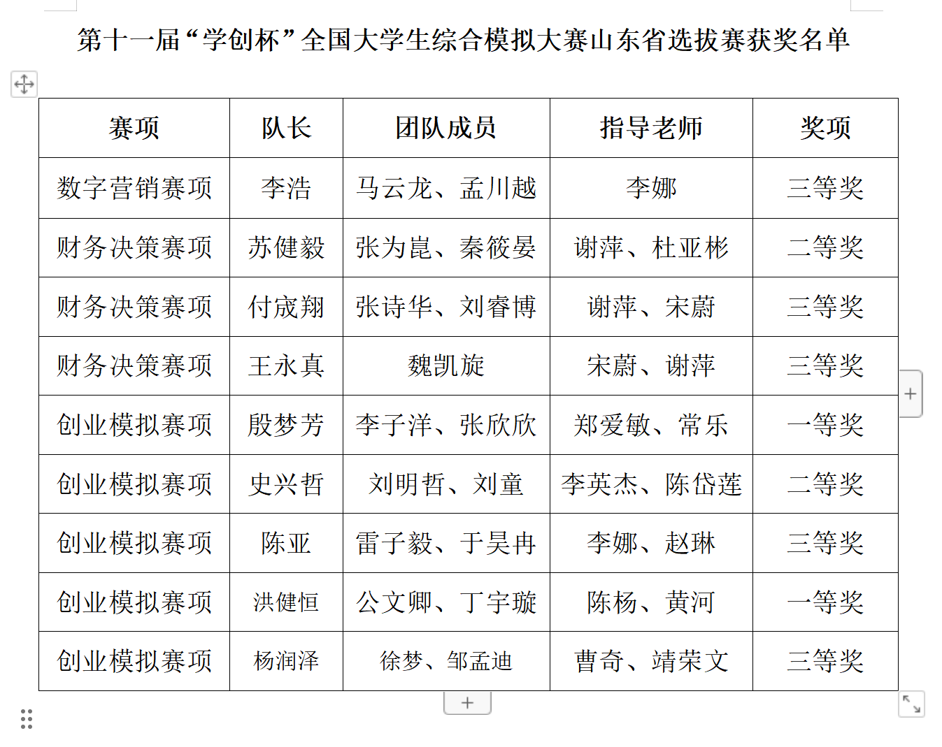 近日,第十一届“学创杯”全国大学生综合模拟大赛山东省选拔赛成绩公布,我校在数字营销赛道(本科、高职组)、财务决策赛道(本科、高职组)、创业综合模拟赛道(本科、高职组)选派的参赛队伍,经过一个多月的精心备赛,最终喜获山东省创业综合模拟赛道一等奖2项、二等奖1项、三等奖2项;数字营销赛道三等奖1项;财务决策赛道二等奖1项、三等奖2项的好成绩。