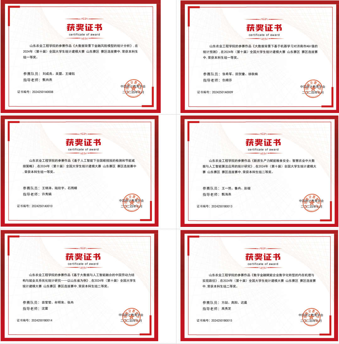 日前,第十届全国大学生统计建模大赛结果揭晓,我校3支参赛队获山东省一等奖、3支队伍获山东省二等奖、14支队伍获山东省三等奖。