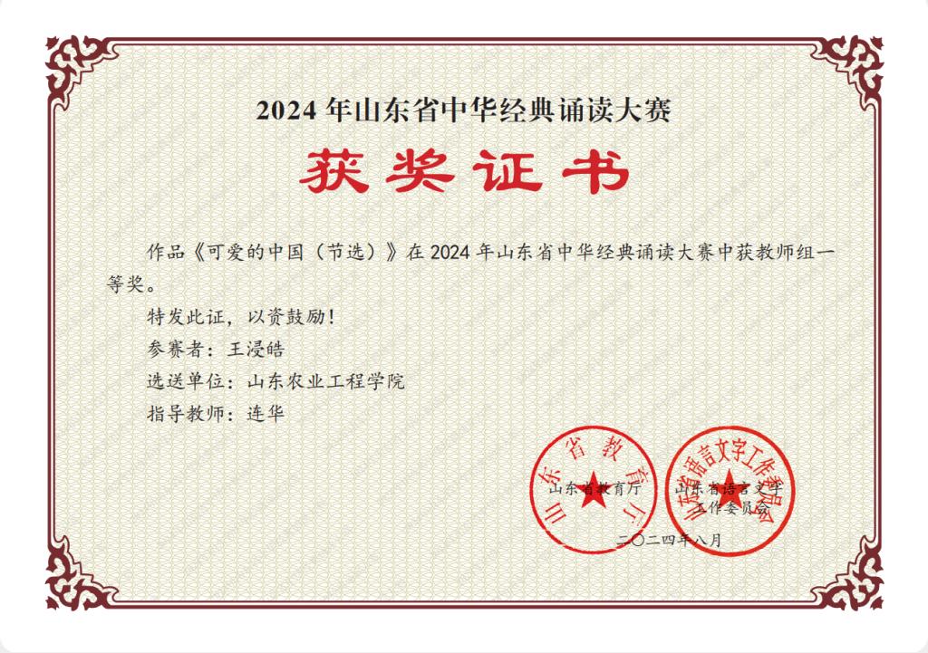 近日,山东省教育厅公布了2024年山东省中华经典诵读大赛获奖名单,我校商学院辅导员王浸皓老师凭借其参赛作品《可爱的中国(节选)》获教师组一等奖,并被省教育厅推荐参加国赛。