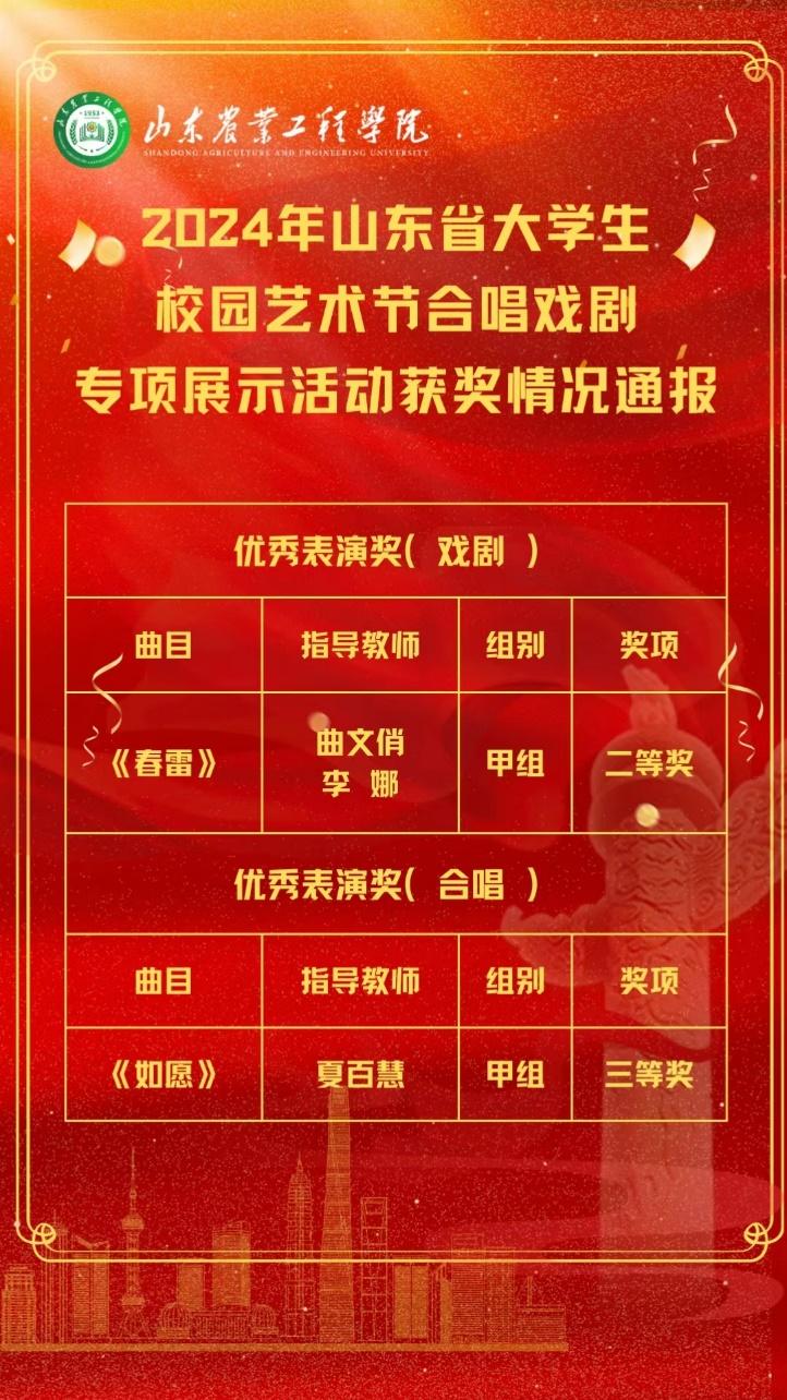 近日,山东省教育厅公布了2024年山东省大学生校园艺术节合唱戏剧专项展示活动获奖名单,学校作品荣获戏剧专项二等奖、合唱专项三等奖。