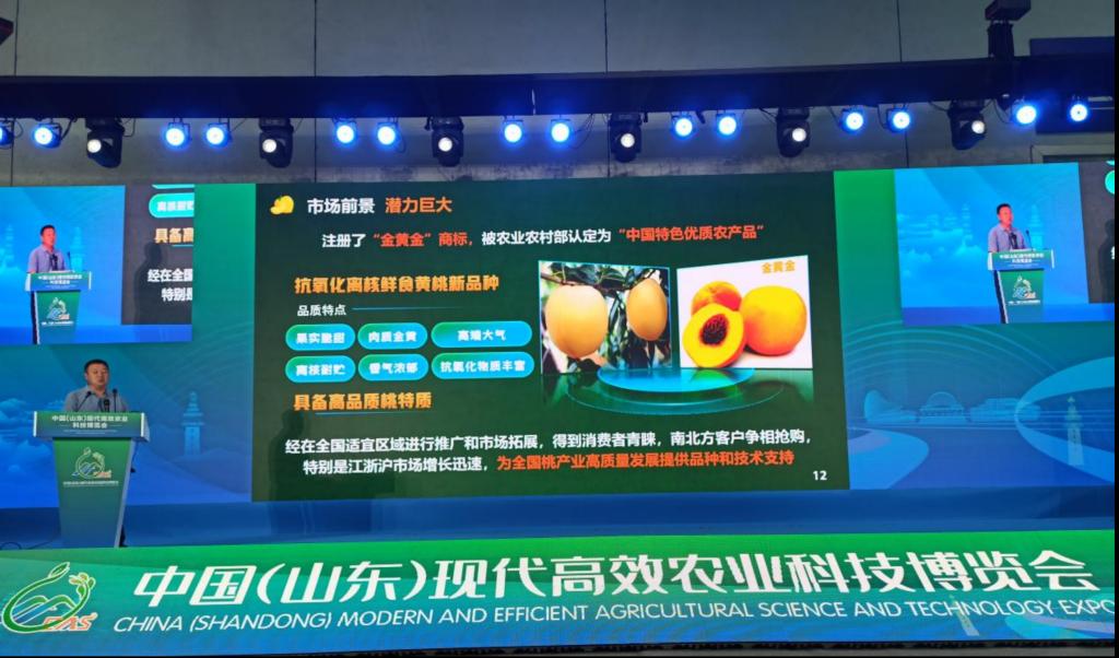 在农业“新品种、新技术、新模式、新动态”四新成果推介发布会上,我校农业科技学院教授刘进推介了自主知识产权的“‘金黄金’系列抗氧化离核鲜食黄桃”,并向与会者详细介绍了“金黄金”系列黄桃新品种的通体金黄、果实脆甜、香气浓郁、离核耐贮等优点,赢得了广泛关注,尤其是“金黄金7号”桃作为国内唯一的优质极晚熟黄桃新品种,其独特的品质和市场潜力更是备受瞩目。