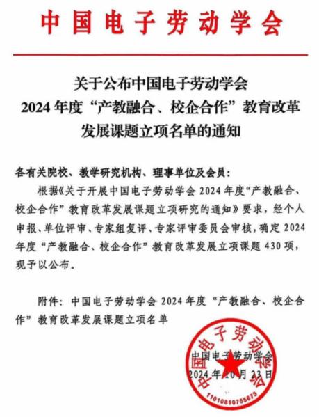 近日,中国电子劳动学会公布了2024年度“产教融合、校企合作”教育改革发展课题立项名单,我校推荐的5个项目均获批立项。