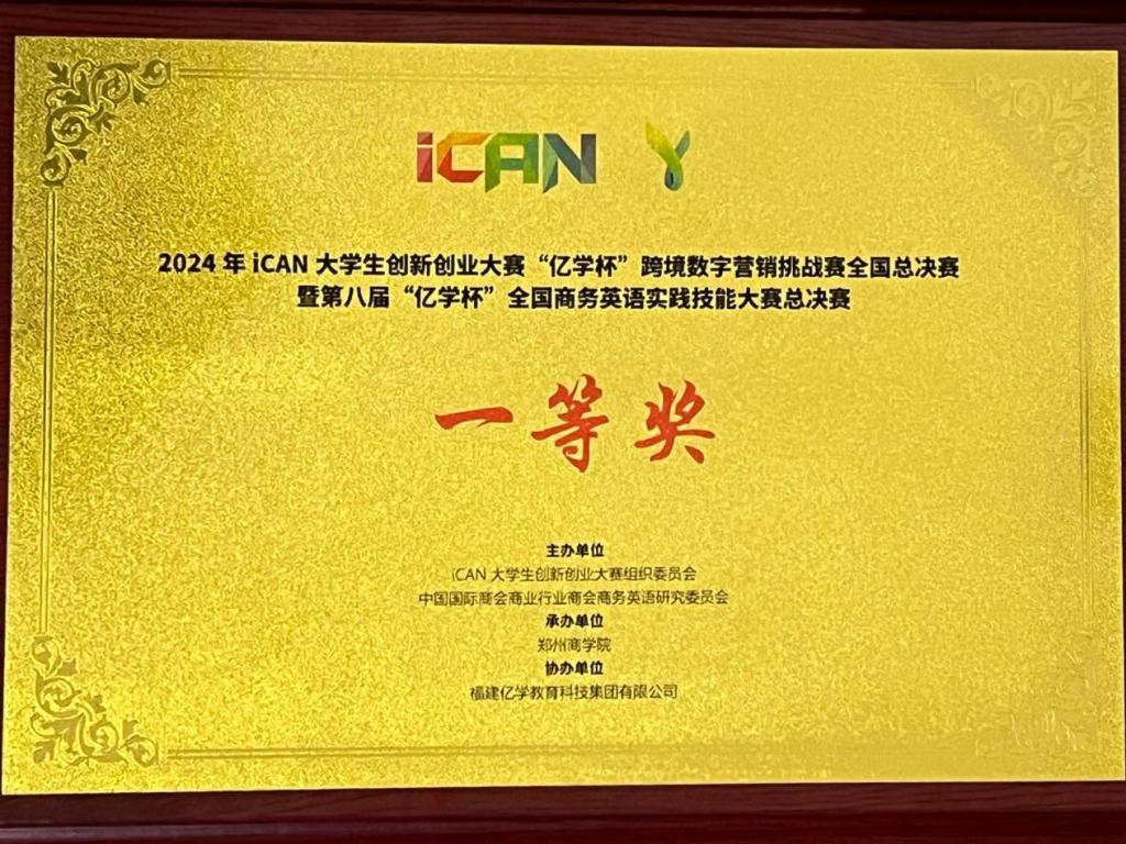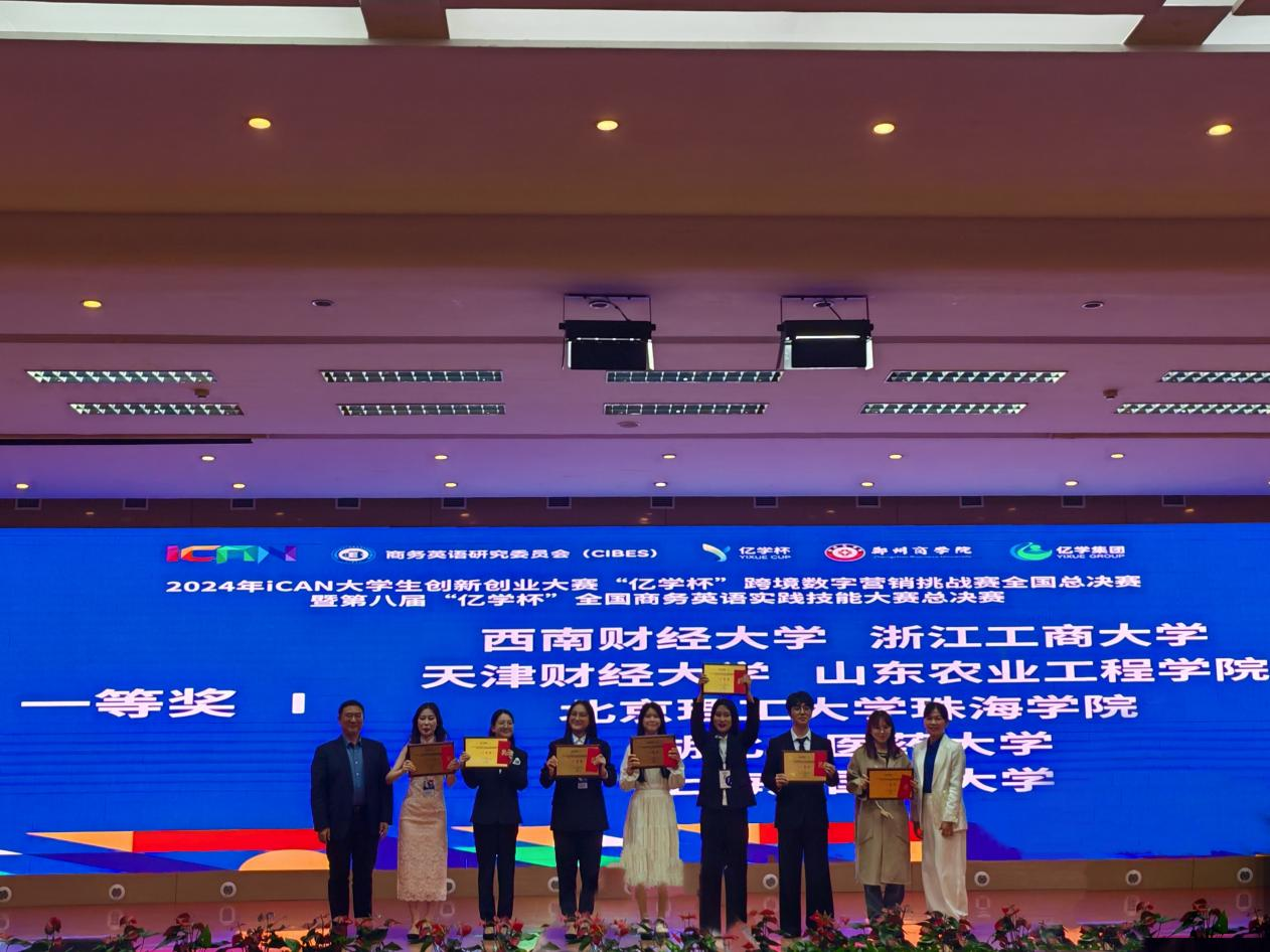11月16日,2024年iCAN大学生创新创业大赛“亿学杯”跨境数字营销挑战赛全国总决赛暨第八届“亿学杯”全国商务英语实践技能大赛总决赛在郑州商学院落下帷幕,由我校人文学院王洁成、吕亚男老师指导的spotlight团队在全国总决赛31支参赛队伍中脱颖而出,荣获全国一等奖。