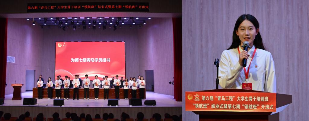 在随后举行的第七期“领航班”开班仪式上,团委相关负责人宣读了本期培训方案,介绍了培训内容和培训要求。与会领导为学员代表赠送了学习用书,并共同见证“农农青语”青马宣讲团的成立。第七期学员代表臧嘉琪作表态发言,她代表第七期“领航班”全体学员郑重承诺,在今后的培训学习中筑牢信仰之基、锤炼实践本色、勇于担当作为,努力成长为信仰坚定、能力突出、素质优良、作风过硬的青年政治骨干。